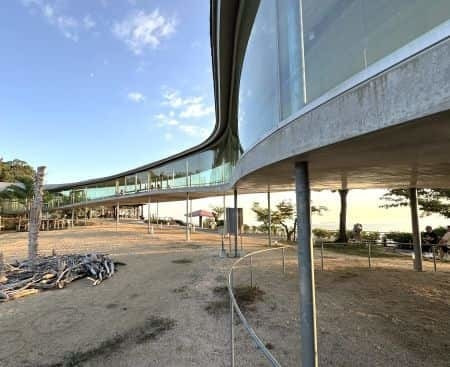 アートの島直島の玄関口としてつくられた海の駅なおしまは、旅客フェリー乗り場としての機能性を持ちながらも、白色の大屋根と極限までに細い柱、開放的な空間設計で海風や太陽の光を受け入れる構造となっています。そのため、長さ約70mの大屋根にも関わらず軽やかにさえ感じることができます。島の人々の日常性と観光客の非日常性が混ざりあいながら、島の自然と一体感を感じられる唯一無二の港です。