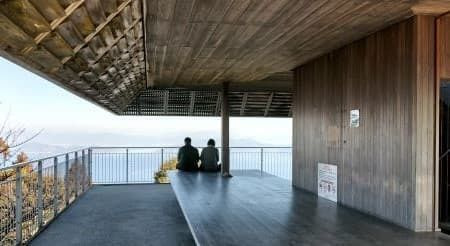 三分一博志氏は、神聖な山岳信仰の場でもあった弥山における「座」の重要性に着目した。座るという行為を引き出せるように頭近くまで伸びる深い庇を設け、座りたくなる展望台とした。