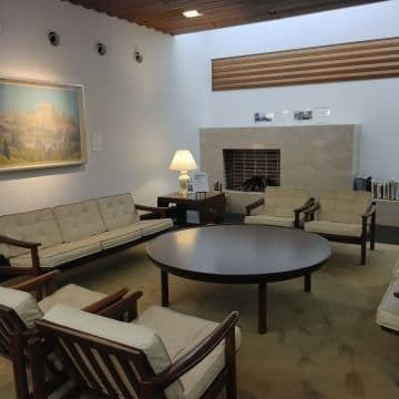 強い柱梁が組み立てるロビーまわりの室内は、棟方志功の力強い装飾壁画の力も加わって、日本の古民家に足を踏み入れたかのような、落ち着いた居心地の良さを訪れた客に感じさせています。浦辺鎮太郎氏がいう「時代性にこだわらない、風土性のある建築」を体現したともいえます。