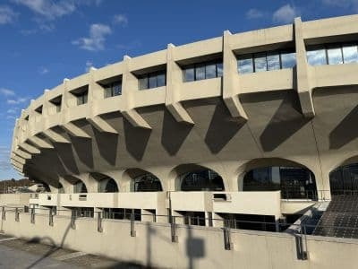 正面エントランスから約20mにおよび上へ跳ねだした部分は。近くで見ると巨大な庇のような下部にはワッフルスラブと呼ばれる格子状になっています。その裏側にアリーナの観客席が階段状に設置されています。