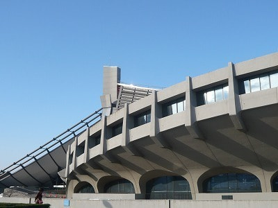 香川県立体育館では吊り屋根とそれを支える巨大なコンクリート壁の曲線の組み合わせは丹下健三氏の独創的な造形が爆発的に開花し、世界に類をみない独自の形態をもったブルータリズムな建物となった。